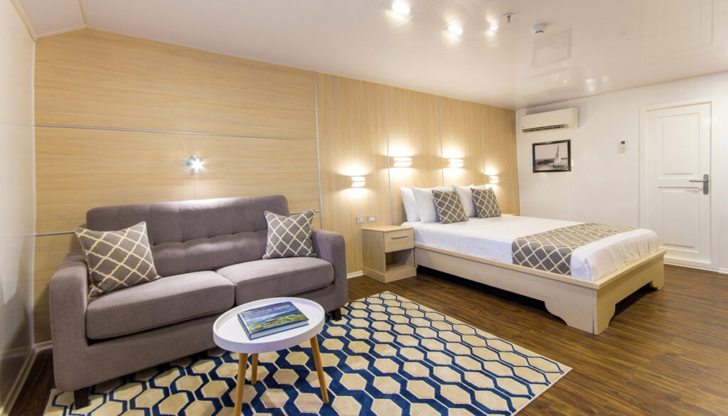 In the afternoon, you will explore the South Plaza Islet. There is a sea lion bull who calls the jetty home, who could delay your landing with his welcoming barking. This islet’s bright red flora and giant Opuntia Cacti that cover the landscape of the island provides food and shelter to thousands of endemic marine and Barrington iguanas. You will also have the opportunity to swim over a reef of boulders that sea turtles, reef sharks, stringrays, and sea lions call home.